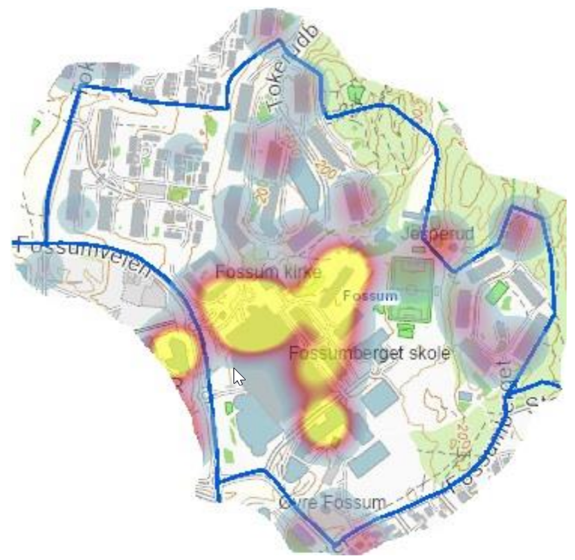 Kartutsnittet over er et varmekart som visualiserer forekomst av antatt utrygghetsskapende hendelser i Fossum-området. Kilde: Politiet