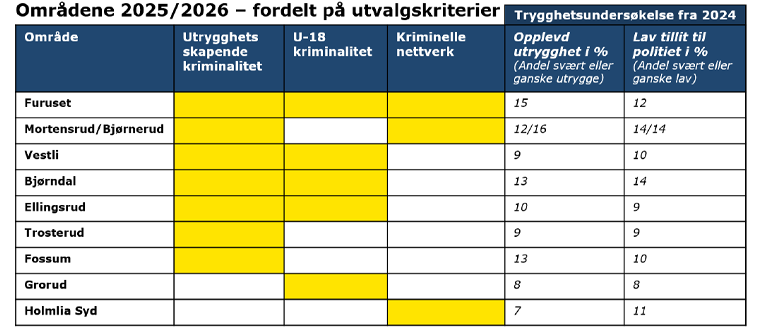 Tabellen over oppsummerer hvilke områder som oppfyller ett eller flere av kriteriene for utrygghetsskapende kriminalitet, ungdomskriminalitet eller tilstedeværelse av synlige kriminelle nettverk. Kilde: Politiet