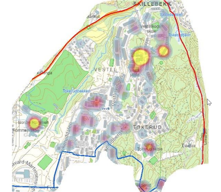 Kartutsnittet over er et varmekart som visualiserer forekomst av antatt utrygghetsskapende hendelser i Vestli-området. Kilde: Politiet