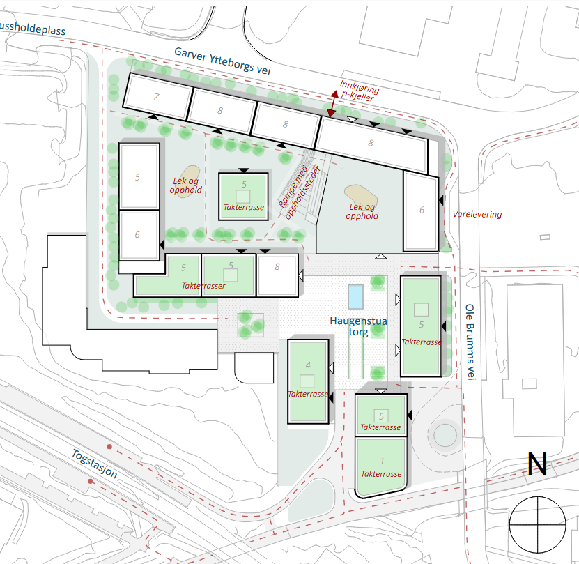 Torget skal kobles bedre til togstasjonen og nærliggende boliger gjennom nye gangforbindelser og åpne fasader. OBOS skriver at dagens strukturer «vender ryggen til torget» – og vil nå «vende Haugenstua utover».